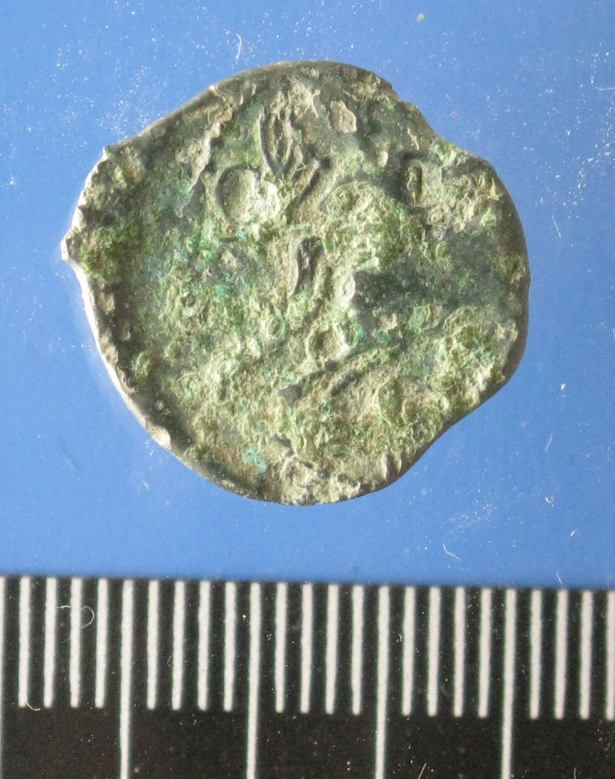 • Cavalier tenant une lance chevauchant à dr., portant un casque et un manteau flottant derrière lui ; au-dessus de la ligne d'exergue et sous les jambes antérieures du cheval, deux S couchés ; à l'exergue IIPAD