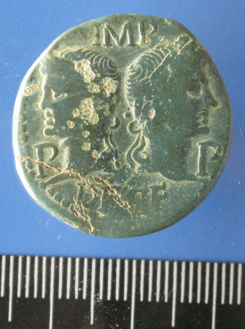 • Têtes adossées d’Agrippa à g. et d’Auguste, lauré, à dr.. Dessous, un P.