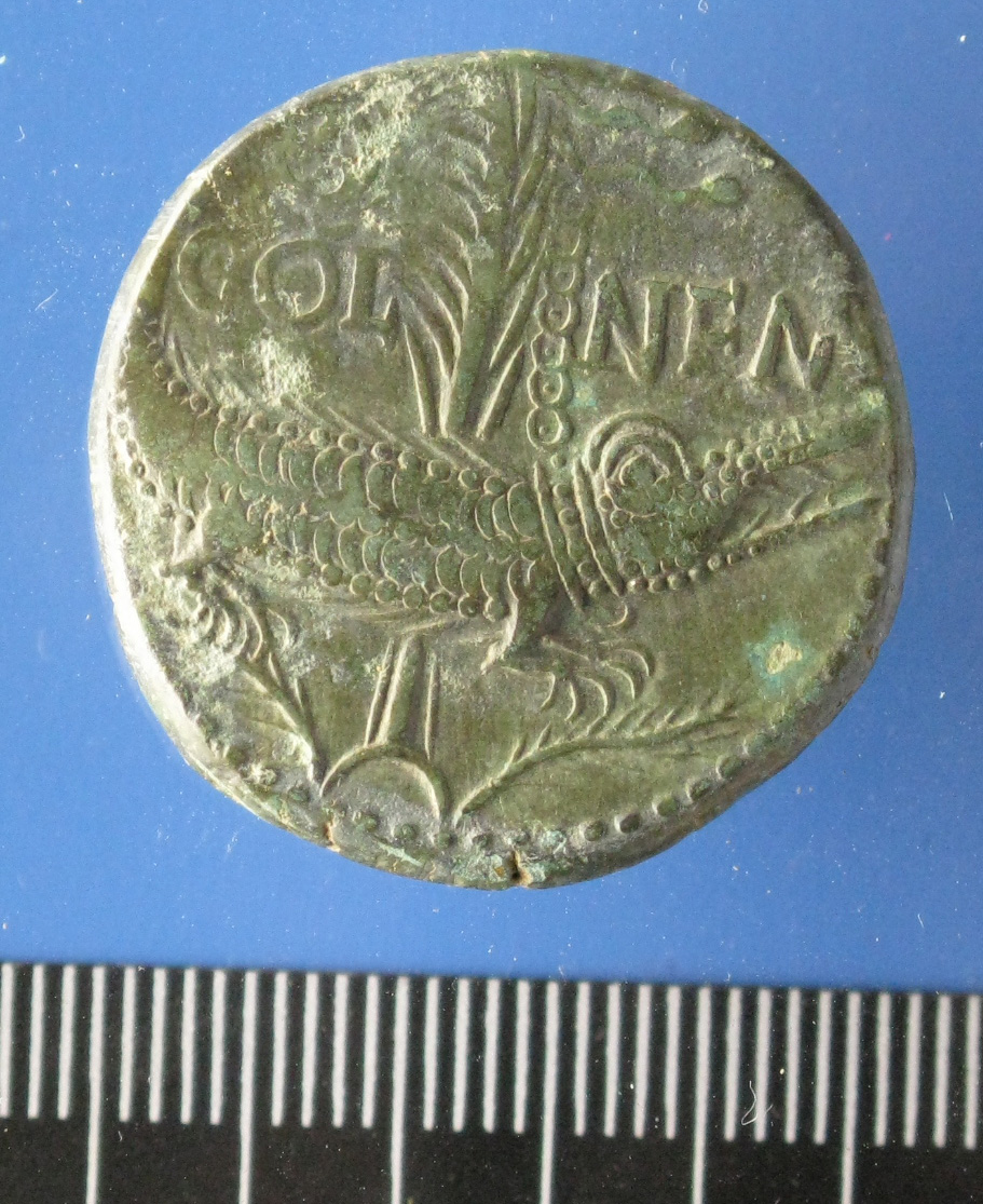 • Têtes adossées d’Agrippa à g. et d’Auguste, lauré, à dr.. Dessous, un P.