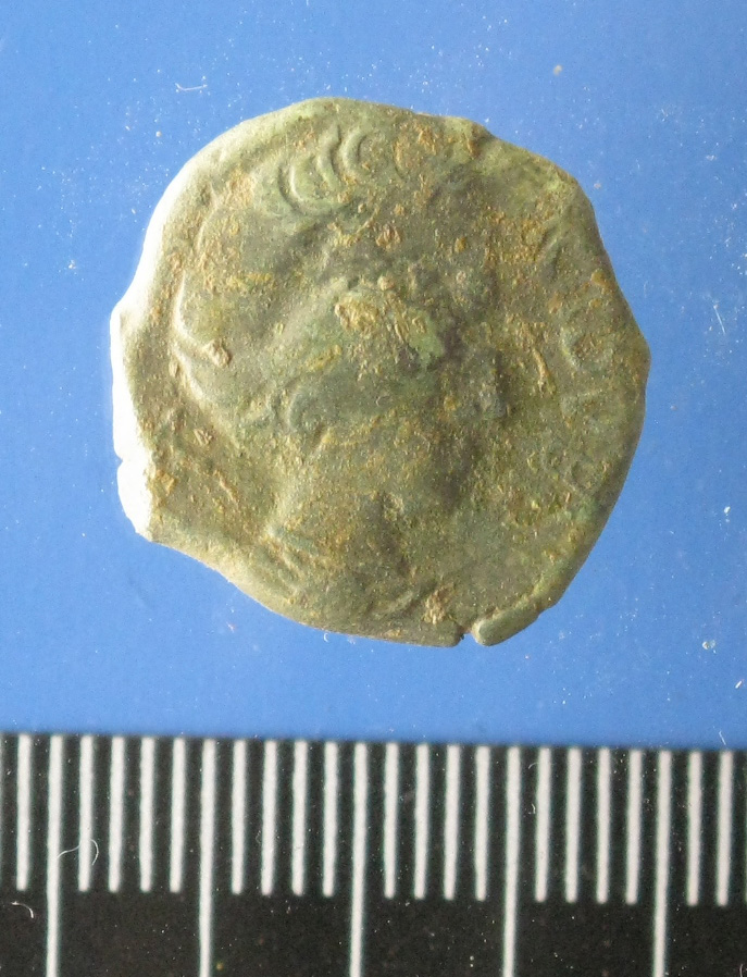 • Buste drapé à dr., le cou orné d'un collier perlé ; les cheveux en mèches régulières ; devant CICIIDV.BRI ; derrière pentagramme