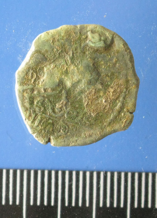 • Cavalier tenant une lance chevauchant à dr., portant un casque et un manteau flottant derrière lui ; au-dessus de la ligne d'exergue et sous les jambes antérieures du cheval, deux S couchés ; à l'exergue IIPAD
