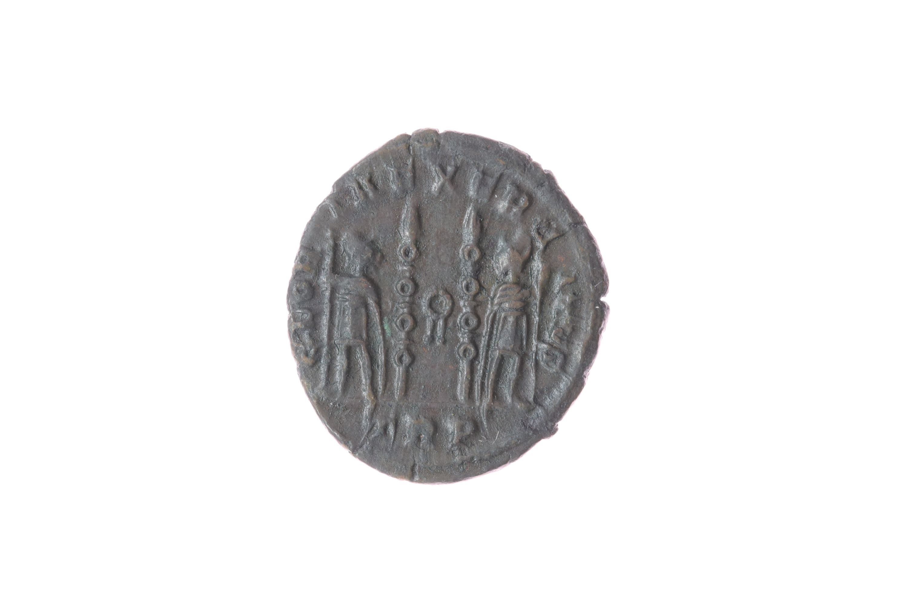 • Deux soldats en face à face tenant un lance inversée et se reposant avec la main sur un bouclier. Entre eux se trouve deux bannières, entre elles une couronne de laurier.