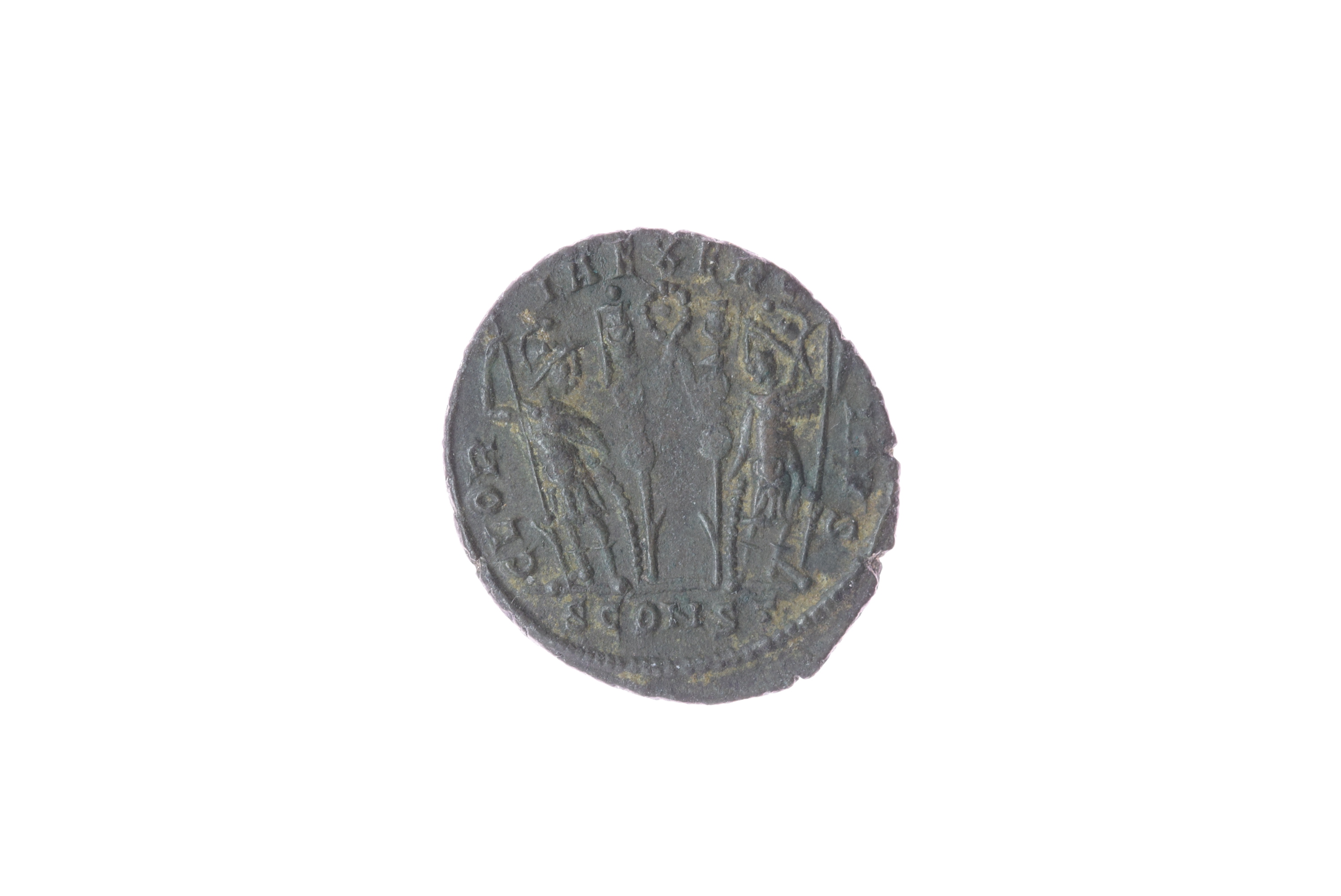 • Deux soldats en face à face tenant un lance inversée et se reposant avec la main sur un bouclier. Entre eux se trouve deux bannières, entre elles une couronne de laurier.