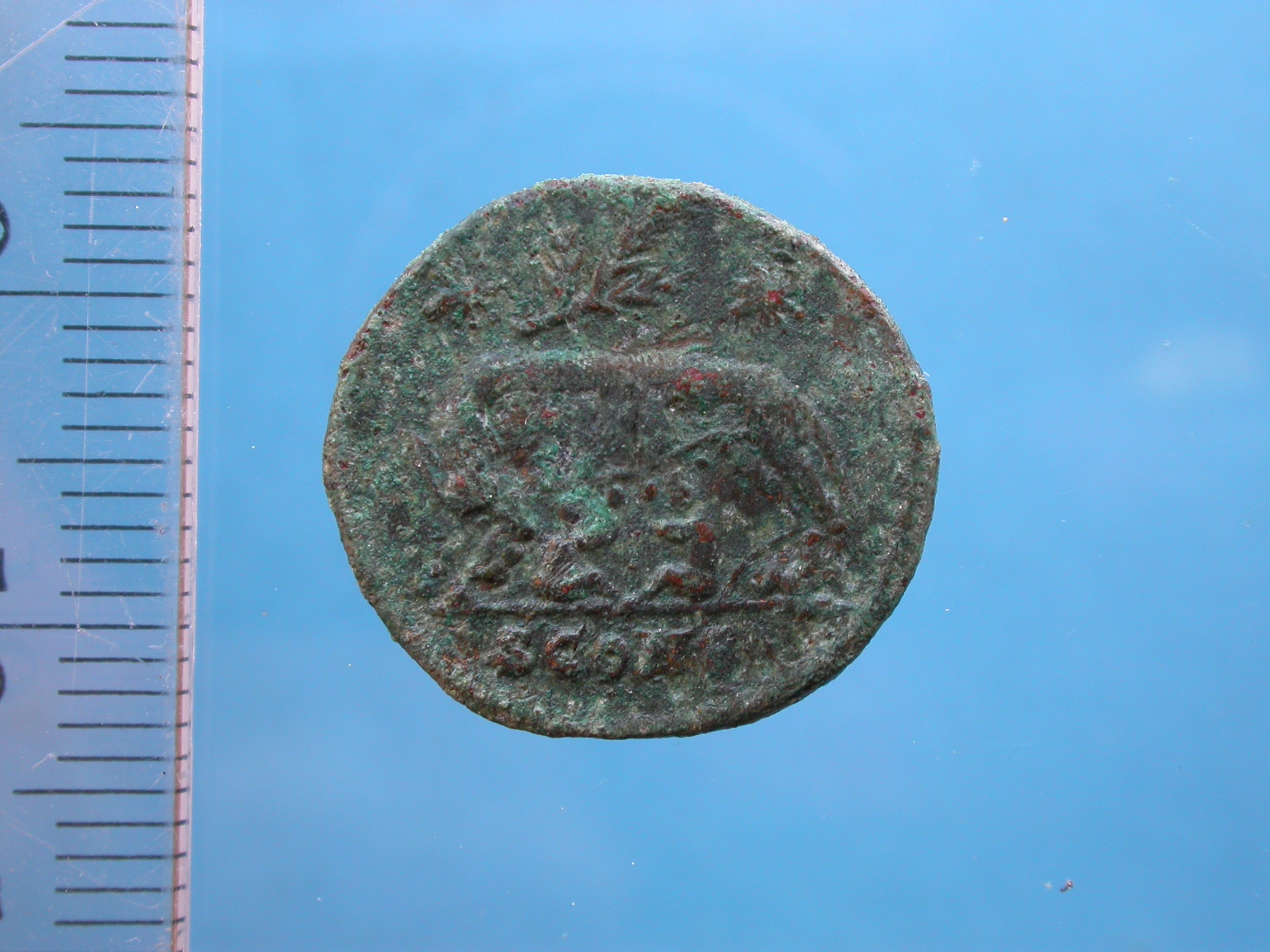 • La Louve allaitant les jumeaux ; au-dessus, deux étoiles , palme