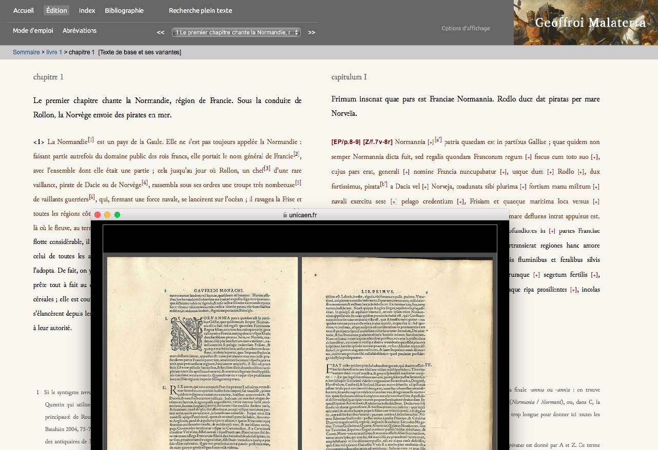 L’édition numérique est entièrement réalisée au pôle Document numérique, à partir d’un moteur d’affichage générique créé dans le cadre de l’Équipex Biblissima, permettant la diffusion de corpus encodés en TEI. Le site intègre des fonctionnalités adaptées à l’édition critique : affichage du texte édité et de sa traduction française, reconstitution de chacun des témoins, images des manuscrits numérisés, exploitation des index anthroponymique et toponymique. Le site est conçu de manière à faciliter les différentes approches du texte par un public varié – spécialiste ou non – et intéressé par des domaines de recherche différents (historiographie médiévale, histoire des conquêtes normandes et de l’Italie méridionale au XIe siècle, transmission des textes, philologie et linguistique latines, etc.). Il sera ensuite alimenté par les livres III et IV.