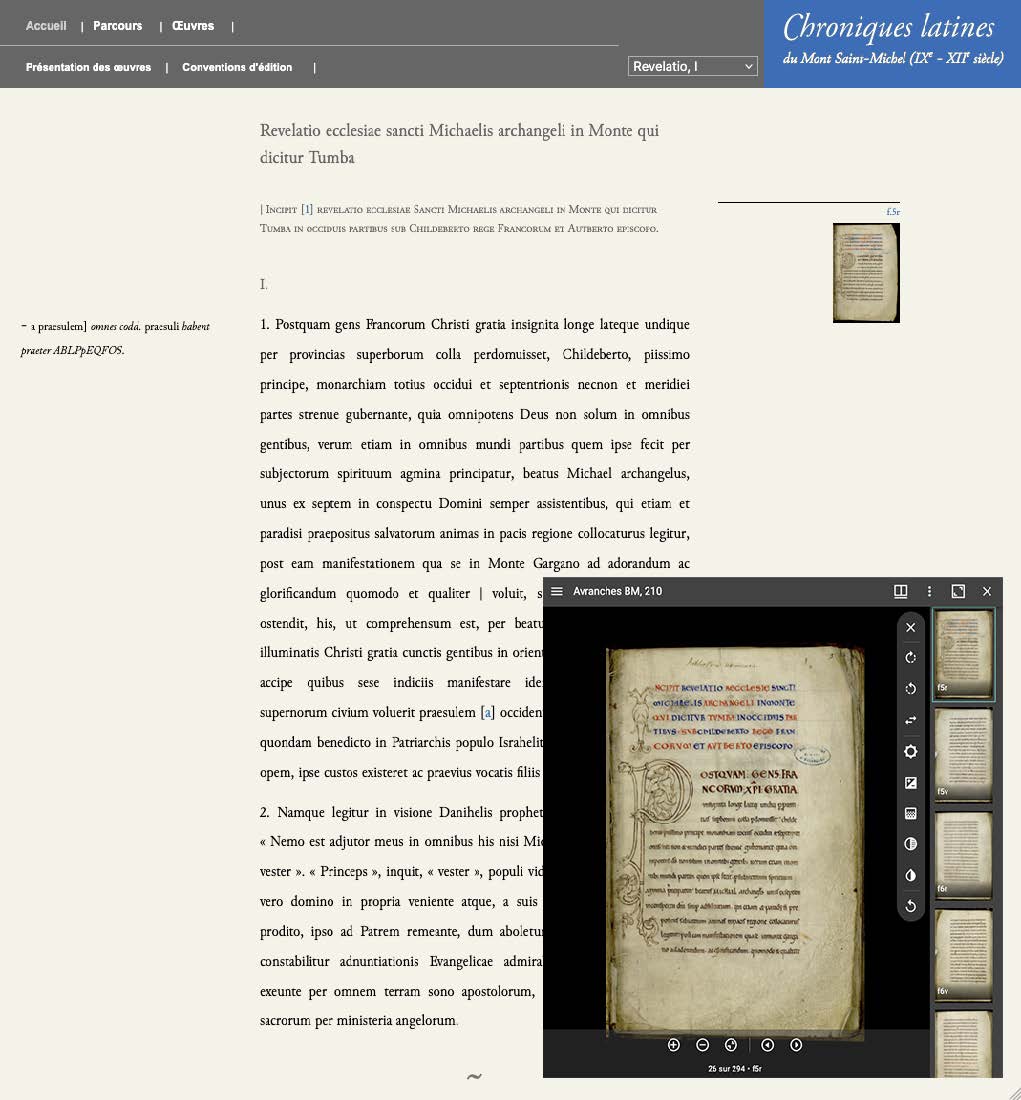 L’édition en ligne des Chroniques latines répond à un objectif de valorisation des fonds patrimoniaux conservés à la bibliothèque d’Avranches. Elle a été voulue comme une invitation à la lecture du livre médiéval et met ainsi le texte des Chroniques latines tel que l’ont établi et traduit P. Bouet et O. Desbordes en regard des pages numérisées des principaux témoins médiévaux.