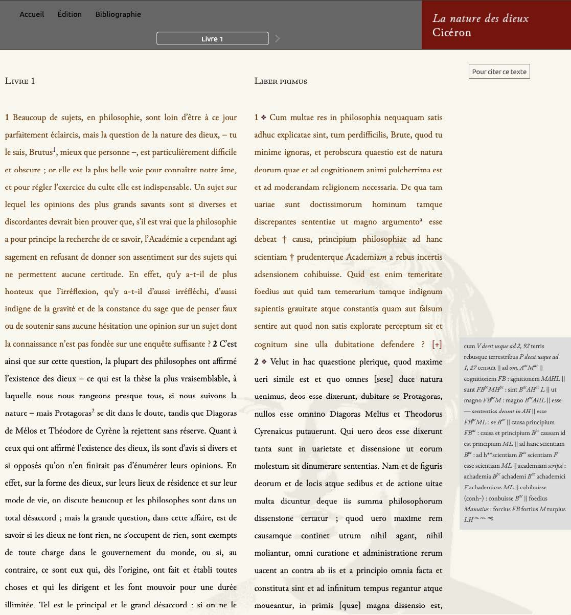 Ce projet consiste en la mise en ligne de l’édition critique de La nature des dieux de Cicéron avec traduction française et commentaire scientifique.