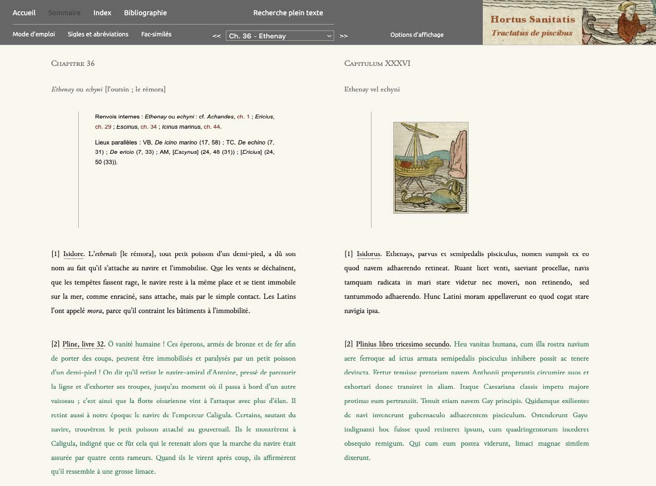 Le pôle Document numérique a également assuré la réalisation du site Internet qui permet d’accéder aux 106 chapitres de l’œuvre. Chaque chapitre présente le même contenu que celui de l’édition papier : texte latin et traduction française, mais les notes sont indifférenciées, et les identifications des poissons sont accessibles sur les pages consacrées au poisson identifié. Les index sont dynamiques et l’effort d’identification des sources est valorisé par un index des citations : le lecteur peut accéder à la liste des citations d’une œuvre ou d’un auteur et retrouver le passage dans son contexte.