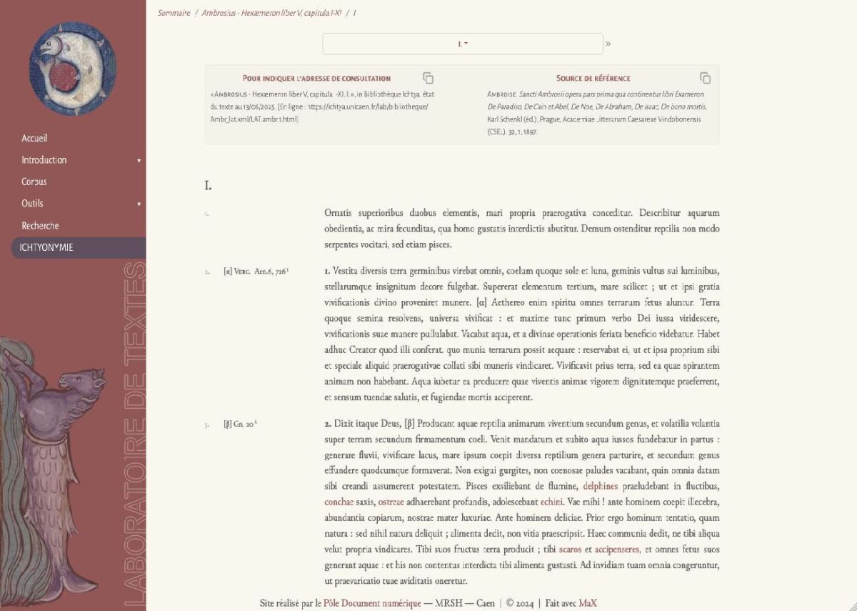Le deuxième axe de ce programme vise la constitution d’une bibliothèque ichtyologique numérique de textes latins de l’Antiquité à la fin du Moyen Âge, la Bibliothèque Ichtya. L’objectif est de rendre accessible à la communauté s’intéressant au savoir ichtyologique ce corpus sous forme de site Internet interrogeable par moteur de recherche. Un ensemble de textes, allant du Ier siècle au XVIe siècle a d’abord été répertorié, océrisé et pré-encodé en XML-TEI au CRAHAM et au pôle Document Numérique de la MRSH. Ce corpus est constitué des textes de Pline l’Ancien, Ausone, Ovide, Solin, Basile de Césarée, Ambroise de Milan, Isidore de Séville, Alexandre Nequam, Barthélemy l’Anglais, Vincent de Beauvais, Arnold de Saxe, Marcus d’Orvieto, Carolus Figulus, Jean Ursin, Pierre Belon, Peter Artedi, du livre 4 de l’Hortus sanitatis, du livre 24 du De animalibus d’Albert le Grand et des livres 6 et 7 du De naturis rerum de Thomas de Cantimpré. Il est marqué par une certaine hétérogénéité : certains textes sont des parties d’une œuvre, d’autres, plus rares, constituent une œuvre complète ; certains sont déjà bien édités et étudiés, d’autres ne le sont pas. L’ensemble représente un volume textuel de près de 1 400 000 caractères. Le rôle du pôle Document numérique se situe dans la formation de l’équipe, l’installation d’environnements de travail et la construction d’un site laboratoire pour la consultation et l’interrogation du corpus.