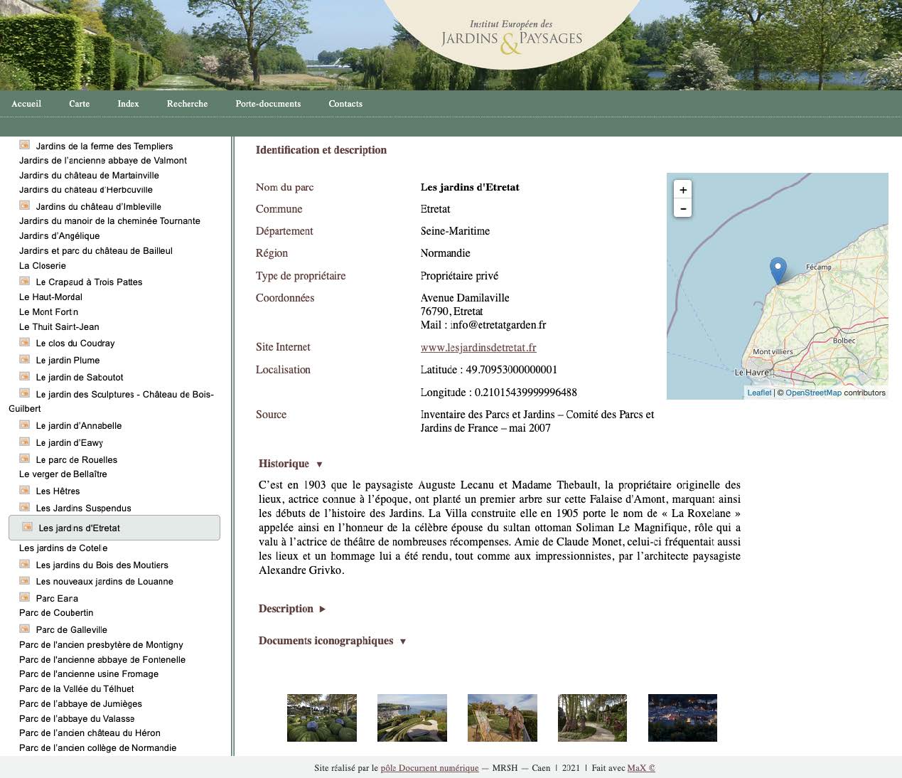 En collaboration avec l’Institut Européen des Jardins & Paysages, le pôle Document numérique de la MRSH conçoit et développe des inventaires numériques relatifs à l’art des jardins en Europe. Grâce à une interface de consultation dynamique, des outils cartographiques, les inventaires s’adressent aux professionnels, aux amateurs éclairés ou aux simples passionnés.