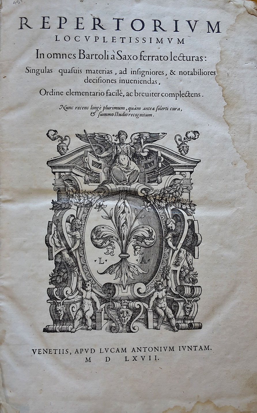 Bartolo da Sassoferrato, Super Authenticis, et Institut, Venezia, Giunta, Lucantonio (junior), 1567.