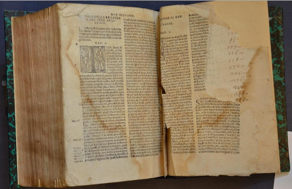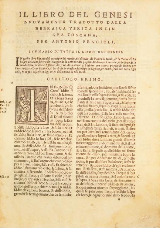 - Notes : ne figure pas dans le catalogue Girard ; conservé à la Bibliothèque du Service historique de la Marine de Cherbourg ; version postérieure de la Bible traduite en italien par Brucioli à partir de 1532 imprimée à Venise. Pour cet exemplaire, la date de parution est estimée entre 1547 et 1550.