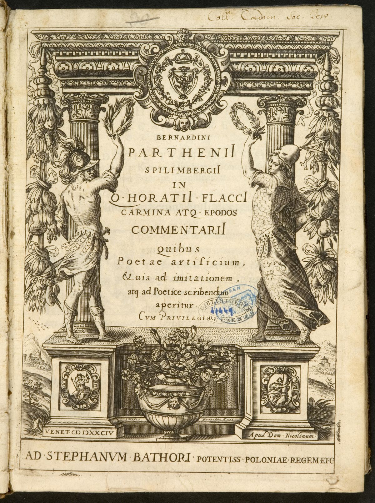 - Titre impr. sur dos de la reliure (« Parthenius in Horatii ») ; ex-libris ms. sur p. de titre (« Coll. Cadom. Soc. Jesu »).
