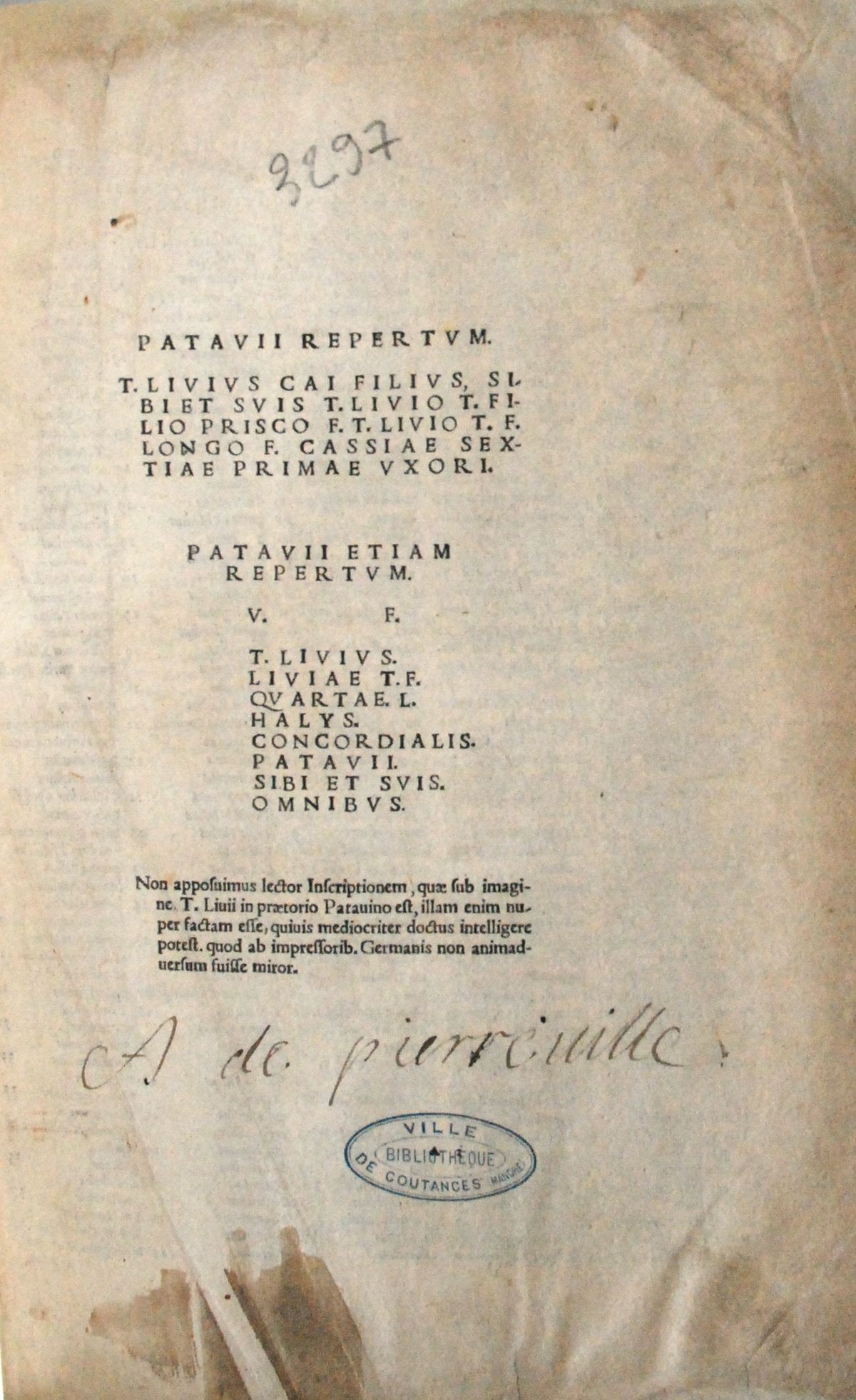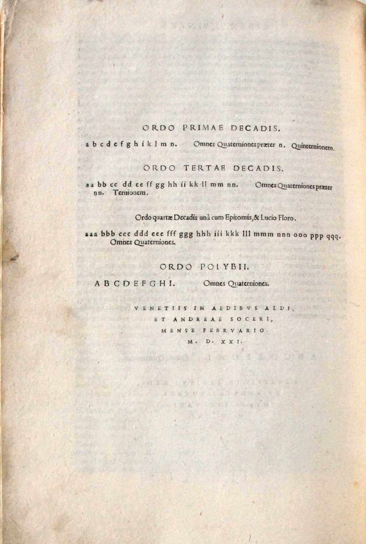 [1] Livius, Titus, Titi Livii Patauini Decas prima, Venezia, Manuzio, Aldo (senior) eredi & Torresano, Andrea (senior), 1521.