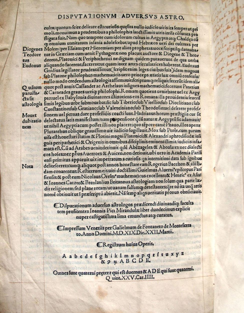 - Notes : dédicace de G.F. Pico della Mirandola, neveu de l'auteur, à Lodovico Maria Sforza au f. A1 v° ; contient Vita Pici Mirandulae de G.F. Pico della Mirandola, De ligno crucis carmen, attribué à Cyprianus Cecilius, et des lettres de contemporains de l'auteur (cf. titre) ; colophon, f. E9 v° : « Impressum Venetiis per Gulielmum de Fontaneto de Monteferrato. Anno Domini .M.D.XIX. Die. XXII. Martii ».