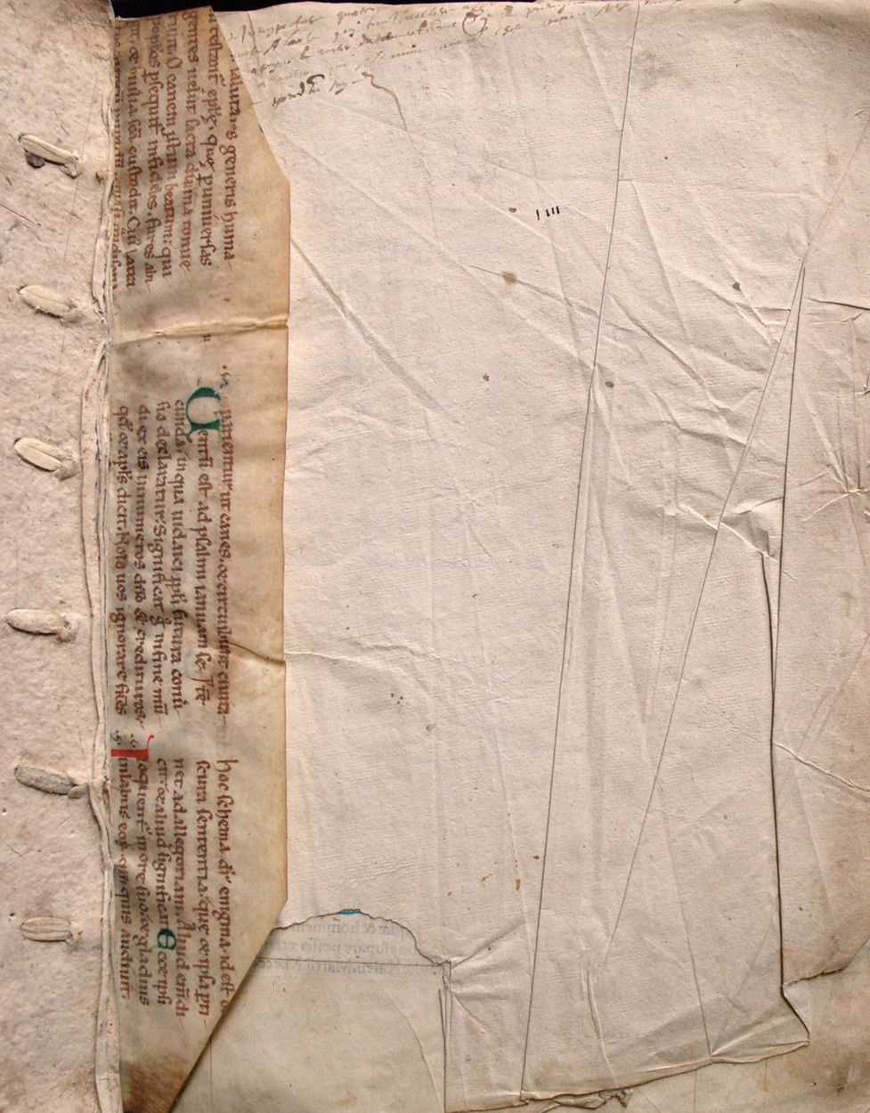 - Restes de titre rapporté ms. sur dos de la reliure ; reliure endommagée ; ais de carton ; notes ms. au recto du premier f. de garde ; ex-libris ms. sur p. de titre (« ex bibliotheca capituli venerabilis Abrincensis viri ») ; ex-libris ms. sur p. de titre (« Gaudin .P. ») ; ex-libris rayé sur p. de titre (« Jehan delahaye ») ; autre ex-libris sur p. de titre ; date ms. sur p. de titre (« 1519 ») ; rares annotations marginales ; notes ms. sur f. E10 r° ; réglure ms.
