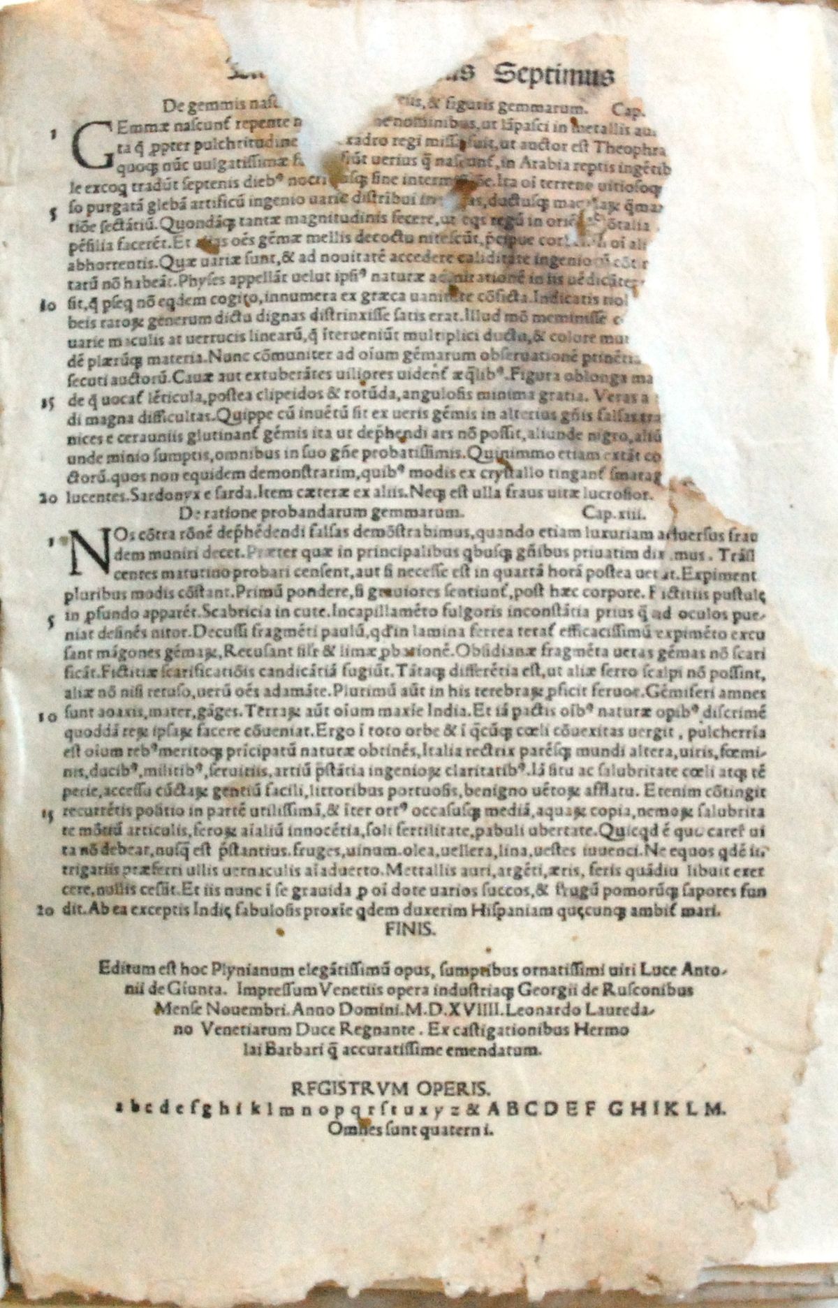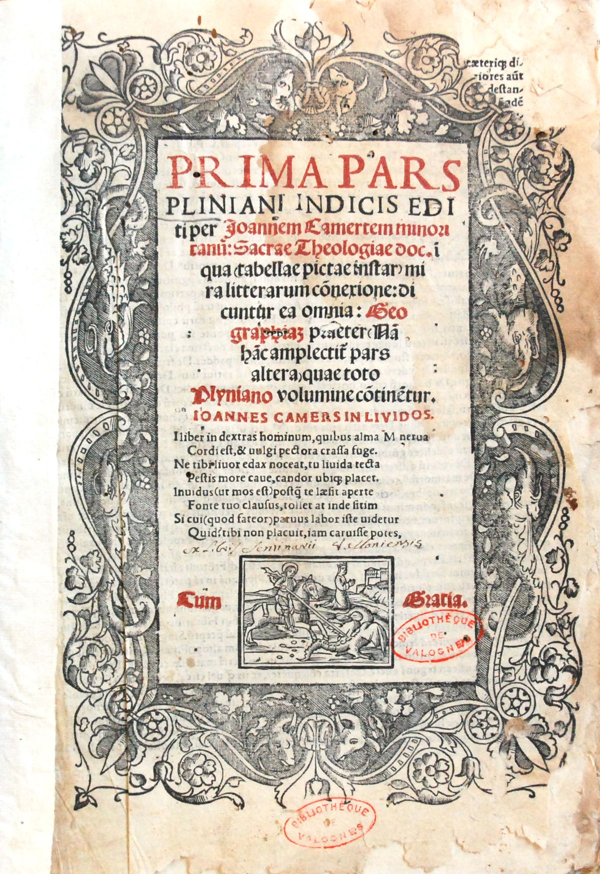- Papier filigrané ; ex-libris ms. sur le premier f. (« Ex libris Seminarii valloniensis ») ; note ms. (erronée) sur p. de titre de la pt.1 (« 1518 ») ; annotations ms. en marge du texte ; dans cet exemplaire, la pt. 2 ( Prima pars Pliniani indici...) est placée avant la pt. 1.