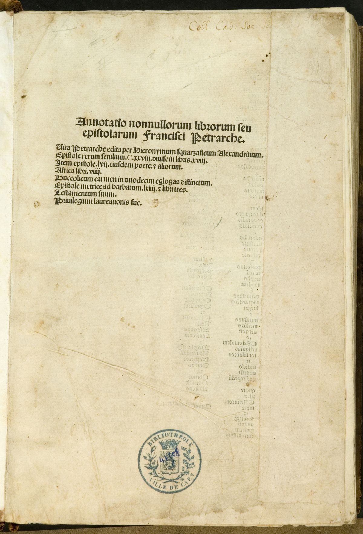 - Notes : texte sur deux colonnes ; pt. 2 : Annotatio nonnullorum librorum seu epistolarum Francisci Petrarche ; colophon f. 24/6 r° : « Impressum Venetiis per Simone de Lucere impensa domini Andree Torresani de Asula .17. Junii .1501.. » ; autre colophon, f. M6 v° : « Venetiis impensis domini Andree Torresani de Asula per Simonem de Luere : anno incarnationis Christi M.ccccci. Die .xxvii. Marcii. ».