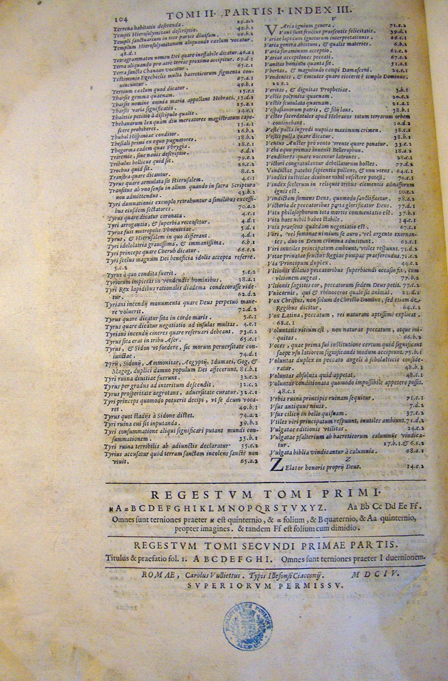 - Notes : pt.1 dans le vol. 1, pt. 2 dans le vol. 2 ; col. de la pt 1 : « Superiorum permissu » ; p. de titre et col. de la pt. 2 « Superiorum permissu et cum privilegiis … » ; texte sur deux colonnes ; colophon pt. 1 au f. I4 v° du vol. 1: « Romae, Carolus Vulliettus. Typis Illefonsi Ciacconij. M D C I V. » ; colophon pt. 2 au f. 3h6 r° du vol. 2 : « Romae ...Typis Illefonsi Ciacconij, excudebat Carolus Vulliettus. ... M D C V. » ; pt. 2 : De postrema Ezechielis prophetae visione ... tomi secundi explanationum pars secunda …, avec son frontispice ; les f. de pl. sont insérés dans la pag. (p. 89-144, 281, 335, 355-358, 388, 419-422, 488, 492) ; var. col. pt. 1 : 1596 et non 1604.
