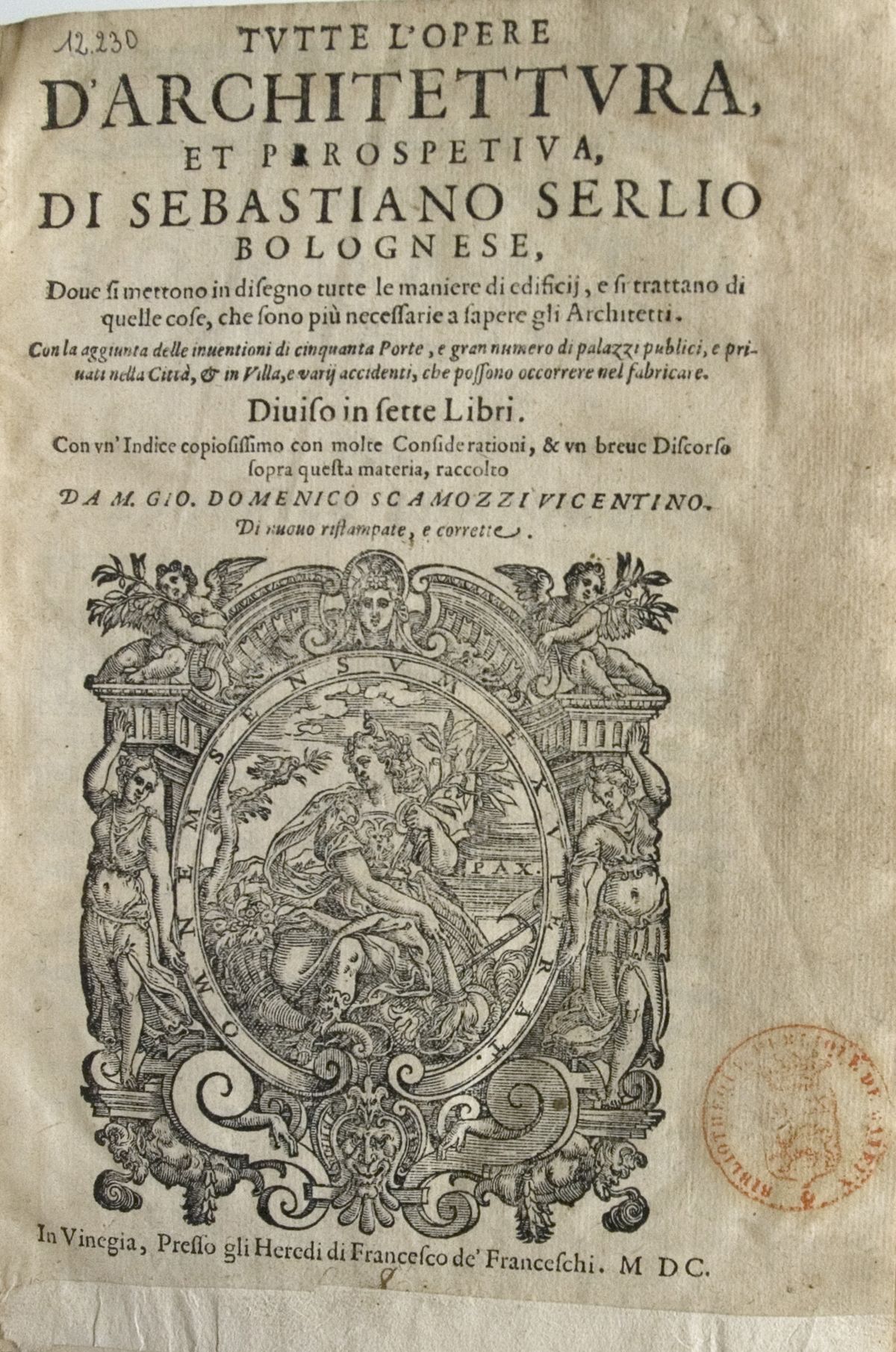 | Titre : | Tutte l'opere d'architettura et prrospettiva [sic], di Sebastiano Serlio bolognese, dove si mettono in disegno tutte le maniere di edificii, e si trattano di quelle cose, che sono più necessarie a sapere gli architetti. Con la aggiunta delle inventioni di cinquanta porte, e gran numero di palazzi publici, e privati nella Città, et in Villa, e varii accidenti, che possono occorrere nel fabricare. Diviso in sette libri. Con un'indice [sic] copiosissimo con molte Considerationi, et un breve discorso sopra questa materia, raccolto da m. Gio. Domenico Scamozzi Vicentino. Di nuovo ristampate, e corrette. |