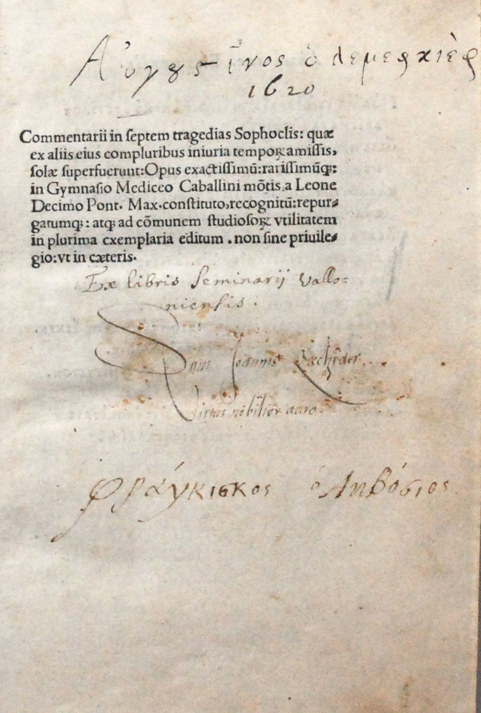 - Titre impr. sur dos de la reliure ; gardes en papier dominoté ; tranches dorées ; ex-libris ms. sur p. de titre (« Ex libris Seminarii valloniensis ») ; annotations ms. (grec et latin) sur p. de titre ; annotations ms. en grec sur les f. B7 v° et B8 v°.