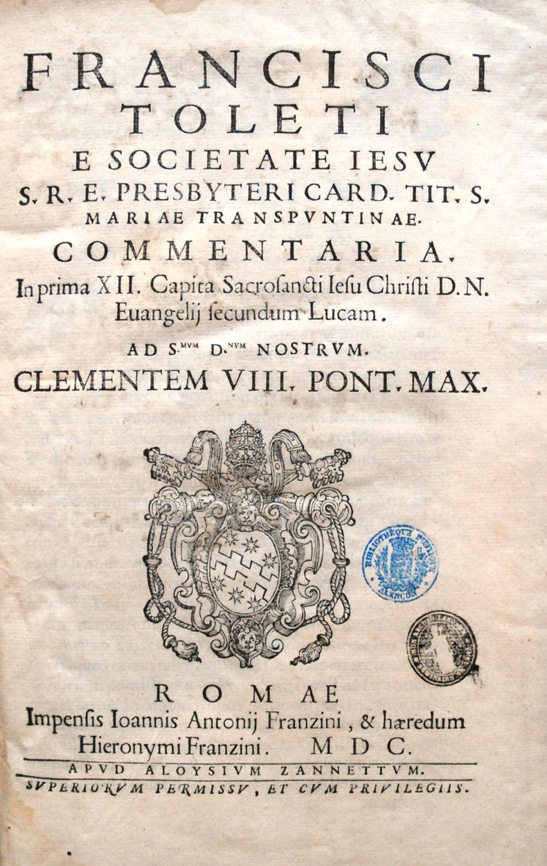 - Notes : coté 5250 dans le catalogue Girard ; p. de titre : « superiorum permissu, et cum privilegiis » ; nom de l'éditeur aux f. *2 r° et *3 r° ; var. A : Francisci Toleti e Societate Iesu ... Commentarij. …