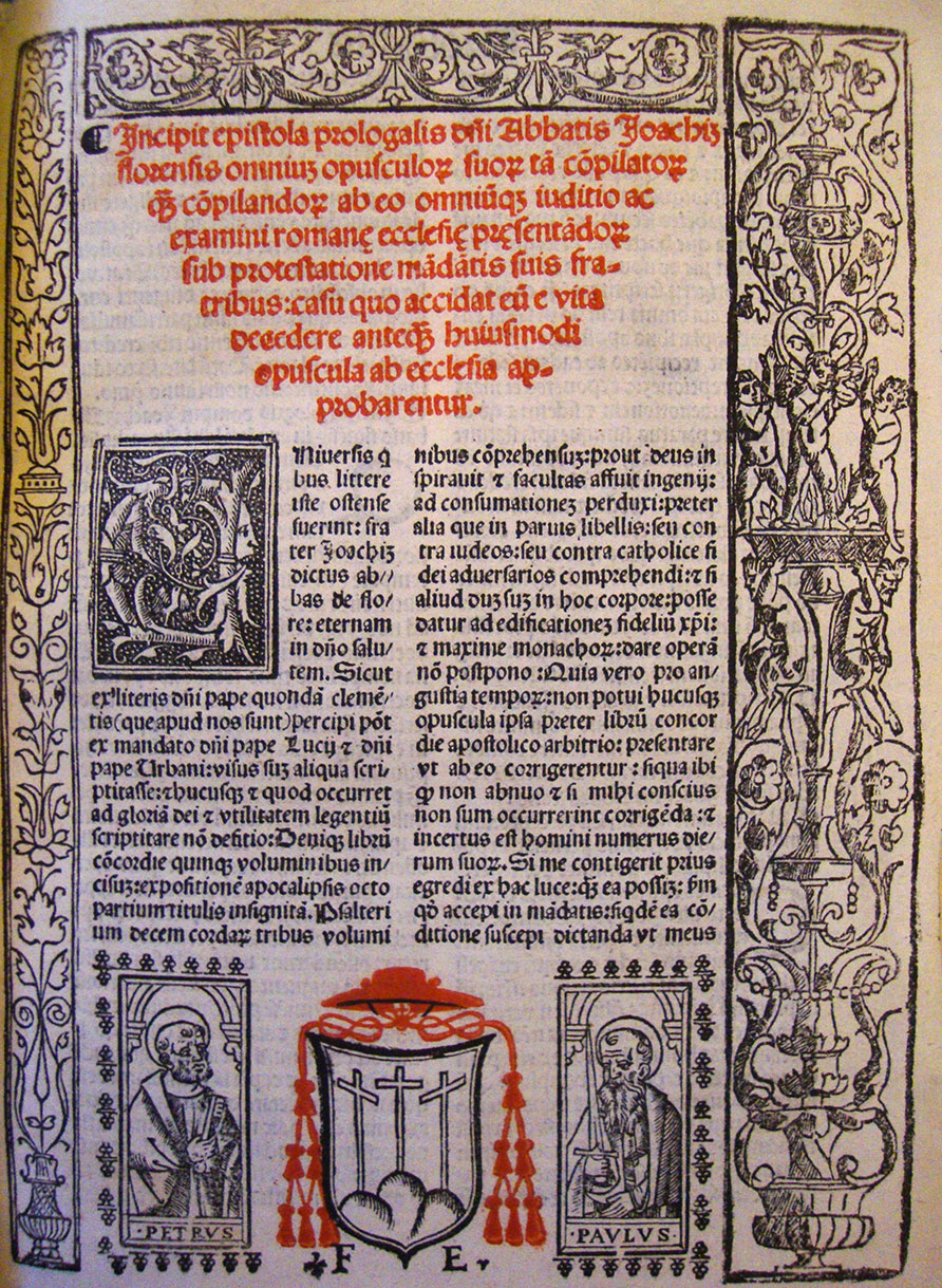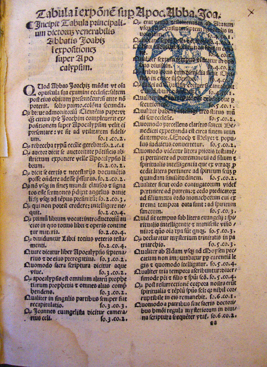 - Notes : ne figure pas dans le catalogue Girard ; colophon (manquant) au f. 2E8 r° : [« Venetiis in calcographia Francisci Bindoni et Maphei Pasyni sociorum impressum : expensis vero heredum Octauiani Scoti ciuis Modoetiensis ac sociorum, 1527 die vero XVII mensis Aprilis »] ; autre colophon (manquant) au f. 224 r° : [« Venetijs : in edibus Francisci Bindoni ac Maphei Pasini socij, 1527 die vero septimo Februarij »] ; autre colophon (manquant) au f. 280 v° : [« Venetiis : in aedibus Francisci Bindoni & Maphei Pasini sociorum, 1527 die XVIII mensis Martii. »] ; nom de l’éditeur à la préface (manquante) ; quelques ill. ; f. A1 r° : « Incipit epistola prologalis d[omi]ni abbatis Joachim fiorensis omnium opusculorum … ».