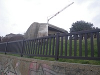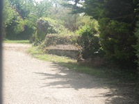 Borne bétonnée qui devait porter une barrière pour bloquer le chemin constituant l'entrée sud-est du site.