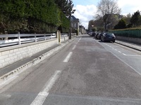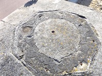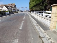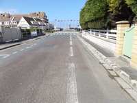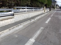 Traces marquées dans les bordures de trottoirs témoignant du passage des chars et autres véhicules chenillés dans les ruelles de Bernières-sur-Mer en juin 1944. Ces traces se traduisent par des encoches successives et relativement identiques le long des bordures de trottoirs de certaines rues de Bernières (ici la rue du Régiment de la Chaudière). Du fait de l'étroitesse des rues, les patins des chenilles des chars ont frotté le long des bordures et ont arraché des morceaux de celles-ci. Les bordures n'ont pas été changé depuis la fin de la guerre et les traces sont toujours visibles.