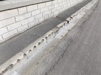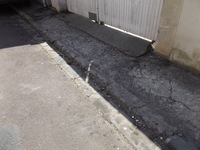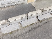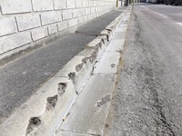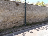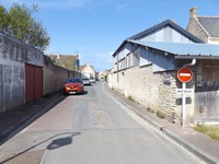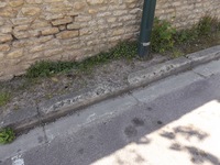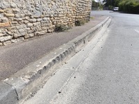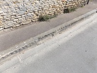 Traces marquées dans les bordures de trottoirs témoignant du passage des chars et autres véhicules chenillés dans les ruelles de Bernières-sur-Mer en juin 1944. Ces traces se traduisent par des encoches successives et relativement identiques le long des bordures de trottoirs de certaines rues de Bernières (ici la rue de la Corderie). Du fait de l'étroitesse des rues, les patins des chenilles des chars ont frotté le long des bordures et ont arraché des morceaux de celles-ci. Les bordures n'ont pas été changé depuis la fin de la guerre et les traces sont toujours visibles.