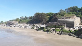 Ringstand pour canon de 5 cm KwK accolé à l’abri E004. Située en surplomb de l’estran et l’extrémité d’une pointe, l’arme pouvait couvrir la plage selon un angle très large. Rapidement après la guerre, l’ouvrage est tombé sur la grève en subissant des dégâts. Le plus gros bloc est actuellement dressé sur l’arrière.