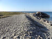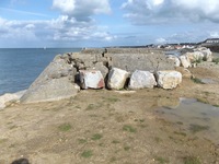 Mur antichar réalisé en béton armé à partir d'un coffrage en bois. Cet élément massif de plus de deux mètres de haut était destiné à empêcher le passage de véhicule. On trouvait des tronçons de mur antichar dans plusieurs endroits de Grandcamp mais systématiquement autour du port ou bien le long du front de mer. Une fois la guerre terminée, ces murs ont été dynamités afin de rendre la circulation à nouveau possible. Il n'y a plus rien de visible actuellement. chicane