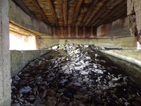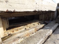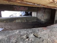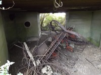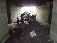 Restes d'une ancienne soute réalisée en béton armé et tôles métalliques dites"tôles métro". Cette soute était implantée au centre du site et permettait un ravitaillement rapide en munitions. Cet élément est aujourd'hui en grande partie détruit. La voûte faite en tôles s'est effondrée et seuls les murets de fondation sont encore observables.