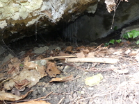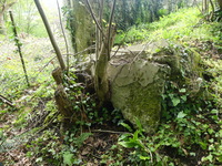 Fragment d'un élément en béton armé ayant pu correspondre à un escalier ou à une entrée. Il n'est pas dans sa position initiale et semble avoir été renversé/basculé. Aucun ouvrage n'est visible sur les photographies aériennes de 1944 à cet emplacement. Il est aujourd'hui recouvert de végétation. D'autres fragments de béton armé se trouvaient à proximité.