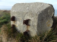 Bloc de béton armé grossier réalisé à partir d'une très grande proportion de graviers. Cet élément est un bloc d'ancrage enterré sur lequel venait s'amarrer l'un des trois haubans qui participait au maintien de l'antenne type Fu.S.An. 700. Ce bloc formait avec deux autres blocs du même modèle un triangle autour du bloc central. Il est intéressant de noter que ce bloc est beaucoup plus imposant en taille que le bloc central. Un élément métallique formant une boucle permettait d'accrocher le hauban. Aujourd'hui ce bloc est toujours visible à son emplacement d'origine.