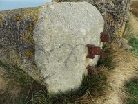 Bloc de béton armé grossier réalisé à partir d'une très grande proportion de graviers. Cet élément est un bloc d'ancrage auparavant enterré sur lequel était fixé l'antenne de type Fu.S.An. 700. D'une hauteur comprise entre 50 et 100 mètres de haut, cette antenne nécessitait un solide ancrage dans le sol afin d'assurer sa stabilité. Quatre éléments métalliques disposant de trous sont fichés dans le béton armé ce qui permettait de venir y boulonner l'antenne. Ce bloc se trouvait au centre d'un triangle formé par trois autres blocs plus importants sur lesquels étaient amarrés les haubans qui maintenaient l'antenne. Après la fin de la guerre, au moment de la remise en culture du champ, ce bloc a été enlevé et déplacé pour ne pas gêner le tracteur. Il a été déposé sur le bord du champ et est toujours visible aujourd'hui.