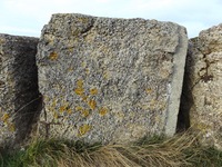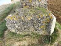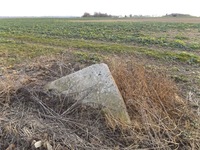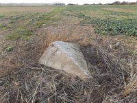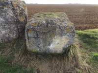 Bloc de béton armé grossier réalisé à partir d'une très grande proportion de graviers. Cet élément est un bloc d'ancrage auparavant enterré sur lequel venait s'amarrer l'un des trois haubans qui participait au maintien de l'antenne type Fu.S.An. 700. Ce bloc formait avec deux autres blocs du même modèle un triangle autour du bloc central. Il est intéressant de noter que ce bloc est beaucoup plus imposant en taille que le bloc central. Un élément métallique formant une boucle permettait d'accrocher le hauban. Après la fin de la guerre, au moment de la remise en culture du champ, ce bloc a été enlevé et déplacé pour ne pas gêner le tracteur. Il a été déposé sur le bord du champ et est toujours visible aujourd'hui.