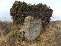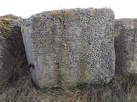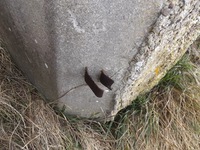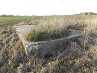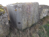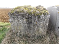 Bloc de béton armé grossier réalisé à partir d'une très grande proportion de graviers. Cet élément est un bloc d'ancrage auparavant enterré sur lequel venait s'amarrer l'un des trois haubans qui participait au maintien de l'antenne type Fu.S.An. 700. Ce bloc formait avec deux autres blocs du même modèle un triangle autour du bloc central. Il est intéressant de noter que ce bloc est beaucoup plus imposant en taille que le bloc central. Un élément métallique formant une boucle permettait d'accrocher le hauban. Après la fin de la guerre, au moment de la remise en culture du champ, ce bloc a été supprimé. Contrairement aux trois autres blocs, il n'a pas été possible de le localiser et on ne sait pas ce qu'il est devenu.