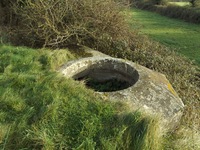 Blocs cubiques de béton armé installés de part et d'autre du chemin menant au Wn. 93. Ces deux éléments, souvent rencontrés dans le secteur de Grandcamp-Maisy, étaient destinés à arrimer un obstacle tel qu'une porte belge. Haut d'environ 1,50 mètre, ces blocs faisaient partie des divers et nombreux obstacles anti véhicule employés par les troupes allemandes. Ils étaient solidement ancrés dans le sol et disposaient de plusieurs anneaux en acier. Sur ces anneaux il était très facile de venir accrocher des obstacles ou bien tout simplement une clôture de barbelés. Ils permettaient ainsi de bloquer rapidement l'accès au Wn. 93 en cas d'approche de véhicules ennemis. Aujourd'hui, ces blocs sont toujours visibles. Ils demeurent en bon état mais sont recouverts par la végétation.