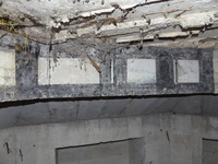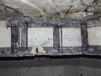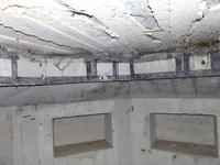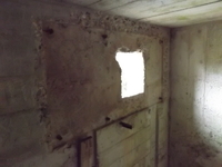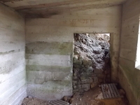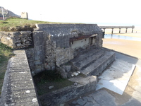 Casemate construite en béton armé à partir d'un coffrage perdu en parpaings. Cette construction massive se compose d'une chambre de tir et de deux soutes à munitions réparties de part et d'autre d'un couloir d'accès. L'embrasure de tir est orientée vers l'est et prend en enfilade la plage en direction de Colleville-sur-Mer. Cette casemate abritait en 1944 un redoutable canon de 88 mm Pak 43/41. Cet élément a été construit à l'emplacement même du café Eden Bellevue qui existait avant la guerre. Le bâtiment a donc été rasé. Néanmoins, afin de dissimuler la silhouette imposante de la casemate, les allemands avaient conservé une partie des piliers de la façade de l'ancien établissement et appliqué un parement de pierres à la casemate afin de faire croire à une construction civile. Le canon était équipé d'un dispositif permettant de fixer une mitrailleuse type Mg 34 directement sur le fût afin de régler les tirs. Un panorama de tir est également présent dans la chambre de tir et représente la baie d'Omaha Beach. Cette fresque a été réalisée entre 1942 et 1944. Les dimensions moyennes de cette œuvre sont de 80cm par 100cm. Elle se trouve dans un état de conservation moyen. Elle est encore visible aujourd’hui.Celle-ci fit l'objet d'une restauration en 2016 ; à noter aussi la présence deux cartes murales peintes à l'intérieur du Bunker (OG_2 et OG_3). OG_1 : Avant même sa restauration on peut facilement reconnaître la plage Omaha. Toute la baie est représentée. Ainsi il est aisé pour les artilleurs d'avoir un visuel sur leurs cibles ce qui explique (en partie) les lourdes pertes subies par les Américains. La vocation de ce panorama de tir est exclusivement militaire mais on ne peut que souligner la qualité des traits. Toutefois la fresque va être fortement dégradée par des tirs de balles au cours des assauts sur la plage d'Omaha. C'est pourquoi la National Guard educational foundation, qui est une organisation à but non lucrative chargée d'entretenir la mémoire de la Garde Nationale américaine décide d'ériger un monument aux morts de la Garde Nationale tombés pendant le débarquement. L'intérieur du bunker va être réaménagé et une stèle est édifiée sur le toit de l'installation. En 2016, la fondation fait appel à un restaurateur du patrimoine : Christophe Gabriel (N°SIRET : 428 492 946 00028 Christophe GABRIEL 17 rue du Javelot Atelier 51 Hall 1 75013 Paris). Il est chargé de restaurer l'OG_1 : une offre était également proposée pour les deux autres œuvres graphiques mais elle restera sans suites. Le restaurateur procède dans un premier temps à un refixage des décors et à une consolidation du support (de la fresque), puis il effectue un nettoyage des surfaces afin d'enlever tout type de résidu. Dans un deuxième temps il corrige les altérations de surface afin de réaliser des retouches dans le but de retrouver un aperçu proche de l'original. Par ailleurs il entreprend un travail de sauvegarde patrimonial à travers la photographie. Il confie cette tache à Olivier Gassion, responsable opérationnel et technique à l'American Battle Monuments Commission. Sources photos : GABRIEL, Christophe, Etude préalable à la restauration de la carte peinte dans le bunker de la plage d'Omaha Beach, 2016 Auteurs photos : C. Gabriel Enfin, un des deux tronçons du mur antichar qui barrait la route côtière était appuyé contre la casemate. Le 6 juin 1944, le canon causa de lourdes pertes parmi les troupes débarquées. La casemate a été touchée par des tirs de marine. De nombreux impacts sont d'ailleurs toujours visibles aussi bien à l'extérieur qu'à l'intérieur. Aujourd'hui, cette casemate est toujours visible et demeure en bon état. Elle sert désormais de soubassement au monument érigé en l'honneur des troupes de la Garde Nationale américaine. L'entrée arrière a donc totalement disparu lors de la construction du monument. Le canon original est toujours présent dans la casemate et fait l'objet d'un entretien régulier. Il est intéressant de noter que le panorama de tir présent dans la casemate a fait l'objet d'une restauration il y a peu de temps.