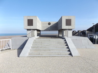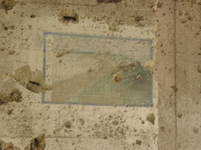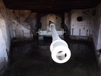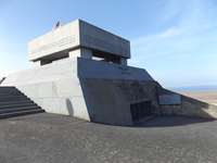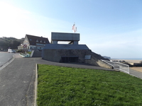 Casemate construite en béton armé à partir d'un coffrage perdu en parpaings. Cette construction massive se compose d'une chambre de tir et de deux soutes à munitions réparties de part et d'autre d'un couloir d'accès. L'embrasure de tir est orientée vers l'est et prend en enfilade la plage en direction de Colleville-sur-Mer. Cette casemate abritait en 1944 un redoutable canon de 88 mm Pak 43/41. Cet élément a été construit à l'emplacement même du café Eden Bellevue qui existait avant la guerre. Le bâtiment a donc été rasé. Néanmoins, afin de dissimuler la silhouette imposante de la casemate, les allemands avaient conservé une partie des piliers de la façade de l'ancien établissement et appliqué un parement de pierres à la casemate afin de faire croire à une construction civile. Le canon était équipé d'un dispositif permettant de fixer une mitrailleuse type Mg 34 directement sur le fût afin de régler les tirs. Un panorama de tir est également présent dans la chambre de tir et représente la baie d'Omaha Beach. Cette fresque a été réalisée entre 1942 et 1944. Les dimensions moyennes de cette œuvre sont de 80cm par 100cm. Elle se trouve dans un état de conservation moyen. Elle est encore visible aujourd’hui.Celle-ci fit l'objet d'une restauration en 2016 ; à noter aussi la présence deux cartes murales peintes à l'intérieur du Bunker (OG_2 et OG_3). OG_1 : Avant même sa restauration on peut facilement reconnaître la plage Omaha. Toute la baie est représentée. Ainsi il est aisé pour les artilleurs d'avoir un visuel sur leurs cibles ce qui explique (en partie) les lourdes pertes subies par les Américains. La vocation de ce panorama de tir est exclusivement militaire mais on ne peut que souligner la qualité des traits. Toutefois la fresque va être fortement dégradée par des tirs de balles au cours des assauts sur la plage d'Omaha. C'est pourquoi la National Guard educational foundation, qui est une organisation à but non lucrative chargée d'entretenir la mémoire de la Garde Nationale américaine décide d'ériger un monument aux morts de la Garde Nationale tombés pendant le débarquement. L'intérieur du bunker va être réaménagé et une stèle est édifiée sur le toit de l'installation. En 2016, la fondation fait appel à un restaurateur du patrimoine : Christophe Gabriel (N°SIRET : 428 492 946 00028 Christophe GABRIEL 17 rue du Javelot Atelier 51 Hall 1 75013 Paris). Il est chargé de restaurer l'OG_1 : une offre était également proposée pour les deux autres œuvres graphiques mais elle restera sans suites. Le restaurateur procède dans un premier temps à un refixage des décors et à une consolidation du support (de la fresque), puis il effectue un nettoyage des surfaces afin d'enlever tout type de résidu. Dans un deuxième temps il corrige les altérations de surface afin de réaliser des retouches dans le but de retrouver un aperçu proche de l'original. Par ailleurs il entreprend un travail de sauvegarde patrimonial à travers la photographie. Il confie cette tache à Olivier Gassion, responsable opérationnel et technique à l'American Battle Monuments Commission. Sources photos : GABRIEL, Christophe, Etude préalable à la restauration de la carte peinte dans le bunker de la plage d'Omaha Beach, 2016 Auteurs photos : C. Gabriel Enfin, un des deux tronçons du mur antichar qui barrait la route côtière était appuyé contre la casemate. Le 6 juin 1944, le canon causa de lourdes pertes parmi les troupes débarquées. La casemate a été touchée par des tirs de marine. De nombreux impacts sont d'ailleurs toujours visibles aussi bien à l'extérieur qu'à l'intérieur. Aujourd'hui, cette casemate est toujours visible et demeure en bon état. Elle sert désormais de soubassement au monument érigé en l'honneur des troupes de la Garde Nationale américaine. L'entrée arrière a donc totalement disparu lors de la construction du monument. Le canon original est toujours présent dans la casemate et fait l'objet d'un entretien régulier. Il est intéressant de noter que le panorama de tir présent dans la casemate a fait l'objet d'une restauration il y a peu de temps.