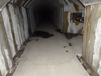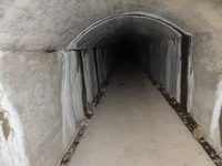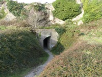 Ce tunnel (stollen en allemand) de 185 mètres de long aurait été creusé dans la roche tardivement (fin 1943 - début 1944) par des travailleurs russes. Outre le couloir principal, il se compose de deux galeries latérales et de deux entrées côté terre (la sortie côté mer donne presque sur les falaises). L'entrée principale côté terre est condamnée et l'on entre désormais dans le tunnel par l'entrée secondaire. Il est difficile d'affirmer à quoi cet ouvrage souterrain était destiné à l'origine. Peut-être au stockage de munitions et de matériels dans les galeries latérales ou encore comme abri antiaérien. On peut retenir ces deux destinations à la fois. Quoi qu'il en soit, au regard de son état de conservation remarquable et de sa longueur, la difficulté que son percement a dû représenter pour les ouvriers russes, ce tunnel fait de béton armé nous apparaît en tout point remarquable.