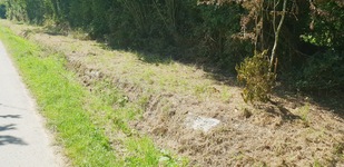 Les installations "légères" de lancement de V1 conservent parfois l'embase et les plots en béton qui permettaient de fixer la rampe de lancement en acier. Cet ouvrage est totalement recouvert par la terre et par l'herbe et il est impossible de s'assurer de son état général de conservation.