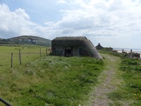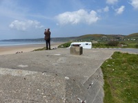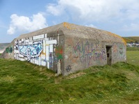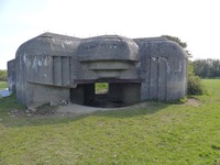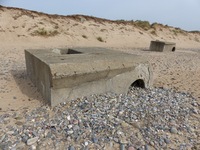 SK/Doppelschartenstand 5cm KwK. Cette casemate permettait d'orienter le canon antichar de 5 cm vers le Sud comme vers le Nord. Elle était également équipée d'une tourelle de char de type R.34 armée d'un canon court de 37 mm. L'ouvrage gît sur la plage et semble être dans un état moyen de conservation. .