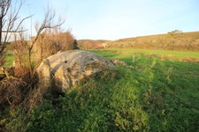 En parcourant ce champ en pente, on découvre un affaissement du terrain. Il est possible qu'une construction ait été réalisée à cet endroit. Cela n'est qu'une hypothèse.